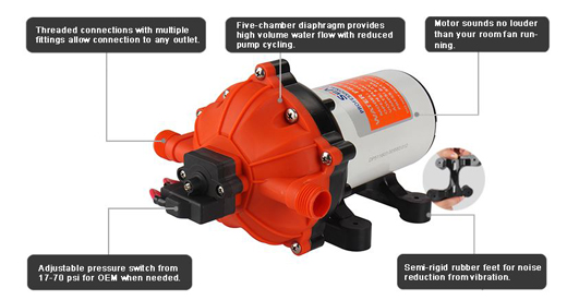 The 51-Series is our Heavy-Duty water pump. It provides high volume water flow with reduced pump cycling, thanks to the large five-chamber diaphragm. These models are designed to run on water systems with no accumulator tank necessary, and up to five fixtures! It is also suited for use with a holding tank water system, as may be found in a boat, RV or remote cabin. It provides up to 5.0 gallons per minute. The 51-Series pumps are self-priming, and can run dry without damage, performance reliable and low current. This automatic demand water system pump has a built-in pressure switch, which automatically starts and stops the pump when the faucet is opened and closed. They are easy to install service and winterize.