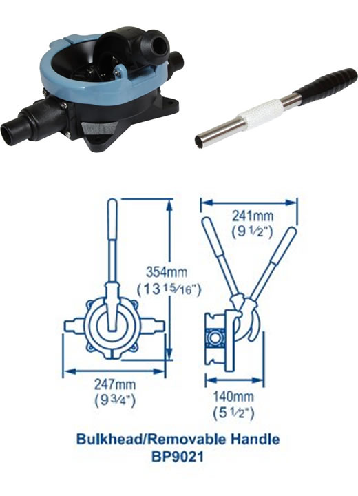 This is a good manual bilge pump for small to medium-sized boats. Lightweight and sturdy, its easy lever action allows fast pumping. Easy to use and maintain, the handle can be oriented in any direction, and the diaphragm is quickly accessed for removing debris. Stepped inlet/outlet nipples for either 1" or 1-1/2" hose connection.