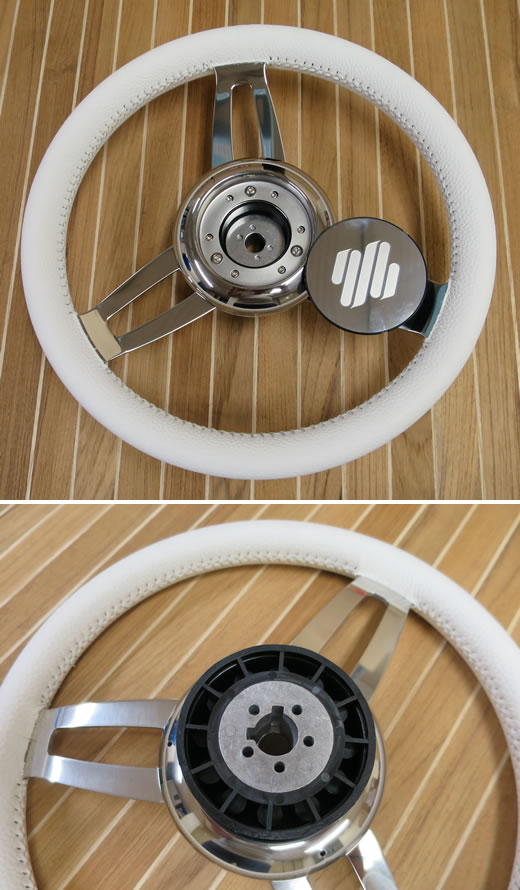 *Give your boat sleek and stylish Italian sports car looks with this special steering wheel. All UFLEX Steering Wheels meet the EEC directive 94/25 requirements about pleasure boats. CE marked in conformity with the EN 28848-EN 29775 and ABYC P22 safety standards. Hub included. Features white grip and chrome spokes.