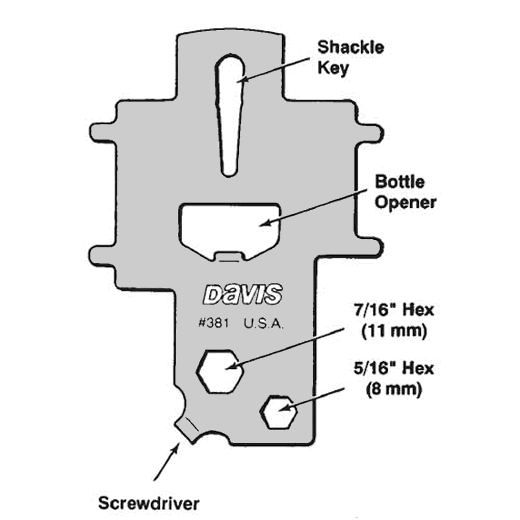 This handy pocket-sized tool fits all deck plate caps: slotted, raised lug, spaced hole, and star (winch handle) type caps. The tool also has common hex sizes: 5/16" (8mm) for hose clamps and 7/16" (11mm) for 1/4" (6mm) bolts. Other features include a shackle key, flat screwdriver, and bottle opener.