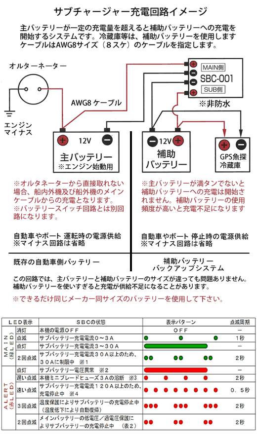 プレジャーボートなどで主バッテリーを充電しながら補助バッテリーも充電することがでるサブバッテリーチャージャー装置です。GPS魚群探知機等を使用するための補助電源をシステム化させるのに最適です。 過去の経験から船外機エンジンの多くは、オルタネーター出力が小さく、新規に回路設置場所が必要となるため不向きと云えます。船外機1基専用コンバイナーシステムはこちらをご覧下さい。